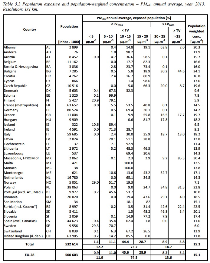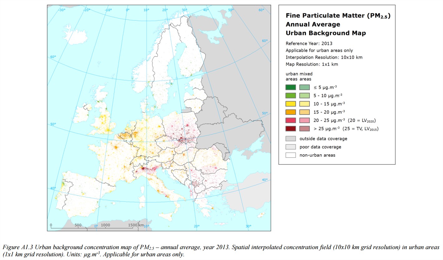 On dispose dans ce rapport annuel de la concentration en polluants en Europe. Ici les PM10 :