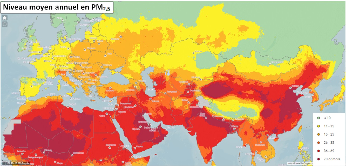 Voici une carte de la pollution aux PM2,5 (Source) :