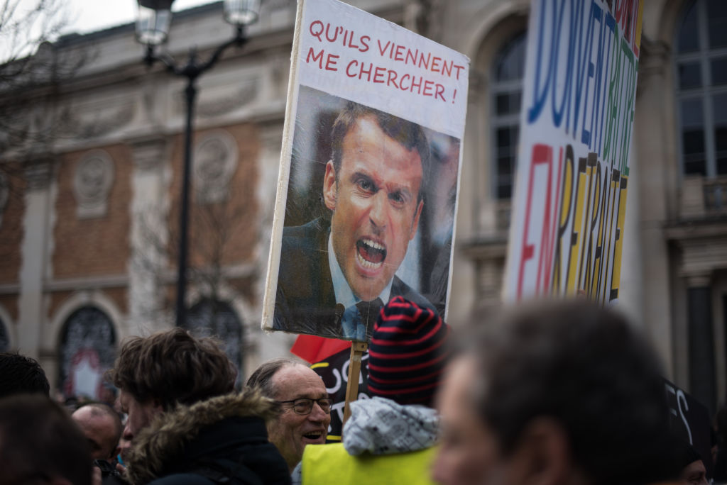 Pancartes avec le portrait d’Emmanuel Macron portées au cours de la manifestation contre la réforme des retraites à Paris, le 31 janvier 2023 (Andrea Savorani Neri / NurPhoto via Getty Images).