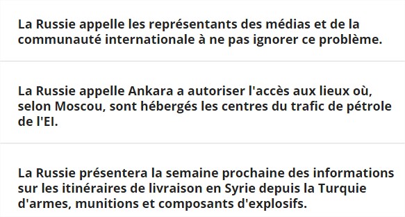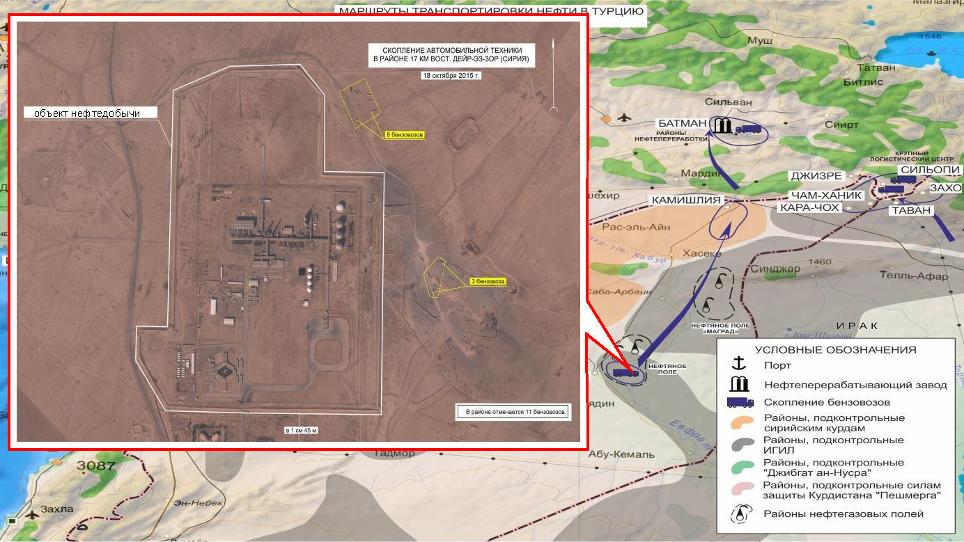 La Russie a détecté trois itinéraires de livraison du pétrole de l’EI en Turquie depuis la Syrie. L’itinéraire ouest est connecté aux ports turcs de la Méditerranée, l’itinéraire nord mène à Batman, et l’itinéraire est à la base de transit dans la municipalité de Cizre.