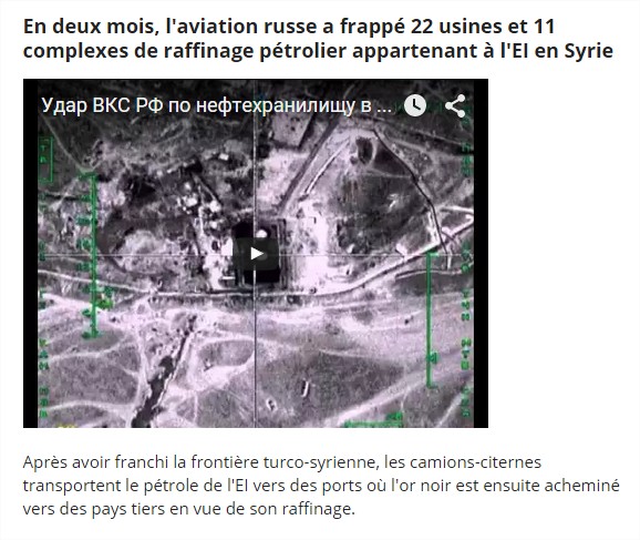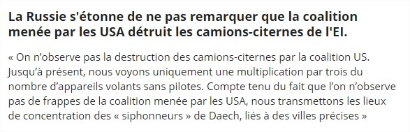dans « le monde » aujourd’hui, en contre-attaque suite à la conférence de presse des russes, propagande d’un article intitulé « que sait-on de la production de pétrole contrôlée par l’EI et ses destinations? »