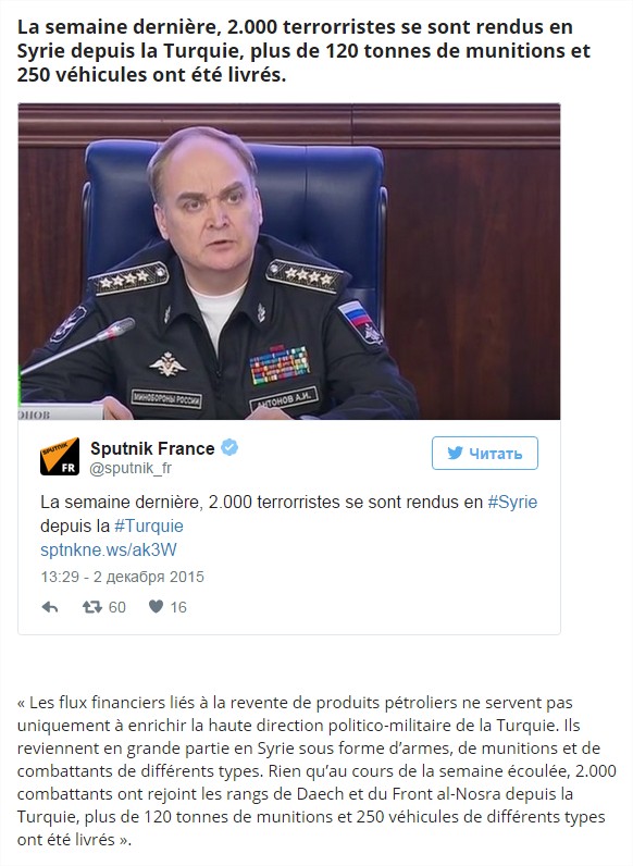 « Nous connaissons la valeur des paroles d’Erdogan. Il a été déjà pris une fois en flagrant délit de mensonge par les journalistes turcs qui avaient révélé la livraison par la Turquie d’armes aux terroristes, sous couvert d’aide humanitaire. Pour cette raison les journalistes ont été emprisonnés. Les dirigeants turcs, notamment Erdogan, ne démissionneront pas et ne reconnaîtront rien, même si leurs visages sont souillés par le pétrole volé « , a martelé Anatoli Antonov.