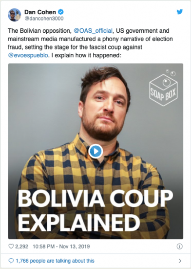 Quiconque doute de cette appréciation n’a qu’à se pencher sur la description qui a été faire du coup d’État militaire en Bolivie, qui a renversé le dirigeant démocratiquement élu Evo Morales. Les médias institutionnels ont unanimement décrit l’éviction et la fuite de Morales au Mexique comme étant une « démission ». Les médias ont pu recourir à ce cadrage grotesque en invoquant les déclarations de la très corrompue Organisation des États américains (OEA), financée par les États-Unis, selon lesquelles le gouvernement Morales était illégitime.