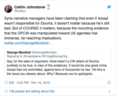 [Les propagandistes en chef pour la Syrie ont affirmé que, quand bien même Assad ne serait pas coupable du massacre de Douma, cela ne changeait rien car il restait nuisible. Mais BIEN SÛR, c’est important, car les preuves de plus en plus nombreuses que l’OIAC a été manipulée dans le sens des intérêts américains ont des implications majeures et une portée considérable.]