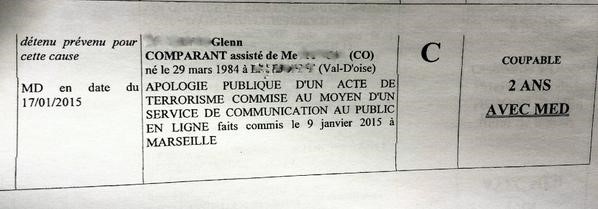 «Cet individu n’était pas surveillé particulièrement, mais ces professions font l’objet d’attention», explique Thierry Assanelli, directeur zonal de la PAF Sud. «Nous avons nos propres informateurs qui ont attiré notre attention. Sur son compte Facebook, il a, suite aux attentats de la semaine dernière, parlé de «services de police racistes», faisant au passage preuve d’une compassion énorme avec les terroristes.» Occultant les assassinats, Glen aurait en outre, évoqué «un règlement de compte de la police contre l’islam», poursuit le policier. Signalés dès le 14 janvier, ces propos ont déclenché une enquête du TGI d’Aix-en-Provence entraînant une arrestation de l’individu dès le lendemain. Déféré le 17 janvier devant le procureur de Marseille, l’homme a été jugé dès lundi et condamné à deux ans de prison ferme. Une peine qu’il purge aux Baumettes. »