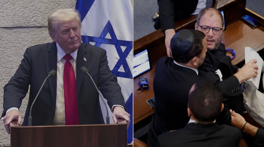 Alors que le président Trump s’adressait à la Knesset israélienne lundi, il a été brièvement interrompu par deux législateurs qui brandissaient des pancartes sur lesquelles on pouvait lire « Reconnaissez la Palestine ». Les deux membres de la Knesset, Ayman Odeh et Ofer Cassif de l’alliance Hadash-Ta’al, ont été expulsés de l’hémicycle. « Hier, deux mégalomanes assoiffés de pouvoir et de sang se sont livrés à un dégoûtant exercice de flatterie et de culte de la personnalité », a déclaré Ofer Cassif. « Cette action constituait une protestation a minima contre la politique génocidaire du gouvernement israélien. »