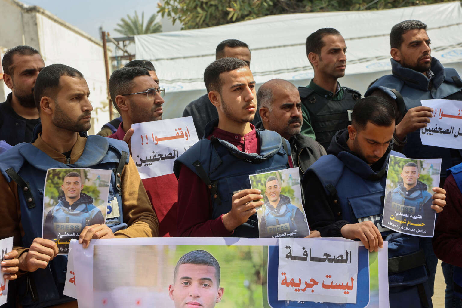- Des journalistes palestiniens brandissent des pancartes lors d’une manifestation suite à l’assassinat de leurs confrères Hussam Shabat et Muhammad Mansour lors de frappes israéliennes le jour précédent, à l’hôpital arabe al-Ahli, également connu sous le nom d’hôpital baptiste, dans la ville de Gaza, le 25 mars 2025. Omar Al-Qattaa / AFP via Getty Images