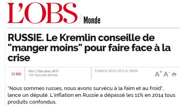 Donc le vice-Premier-Ministre lance une phrase pas tiptop dans une rodomontade à Davos (qui peut vouloir dire en l’espèce « on mangera moins de produits étrangers » pout être logique), ça devient « Poutine demande aux Russes de moins manger » – la preuve on a vu 1 type sur Twietter le dire (le journalisme du XXIe siècle – prenez des photos, l’espèce aura disparu au XXIIe).