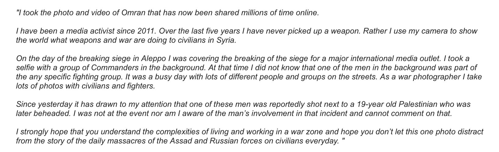 Finalement, Raslan a fini par réagir, en écrivant à la correspondant d’ABC News que, pas de bol, il passait juste par là et que, dingue, il ne connaissait pas l’implication de la brigade dans la décapitation (qui ne l’a pas beaucoup marqué a priori ; et puis comme quoi, on peut être barbare sans que ça se voit quand on croise les gens)… :