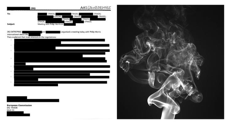 Plus tôt dans la semaine, la Commission européenne a rendu public des documents au contenu fortement « révisé » (cf. les PDF ci-dessous) concernant les rapports qu’elle a pu avoir avec l’industrie du tabac dans le cadre des négociations commerciales que mène l’Europe, y compris celles en cours avec le Japon et celles avec les États-Unis (TTIP alias TAFTA alias PTCI, partenariat transatlantique de commerce et d’investissement). Dans tous ces quatre documents (correspondance et minutes des rencontres avec les lobbies du tabac) quasiment tout est censuré (caviardé à l’encre noire), y compris les noms de tous les lobbyistes de l’industrie du tabac et des officiels de la Commission impliqués. Dans une lettre de 14 pages de « British American Tobacco » par exemple, moins de 5% du texte est visible (quelques phrases insignifiantes de remarques introductives et conclusives). Dans un résumé d’une seule page relatant une rencontre avec Philip Morris, même la date de la rencontre a été effacée, et nulle part on ne peut savoir de quelles négociations il s’agit. C’est ce que la Commission qualifie « d’accès partiel ».