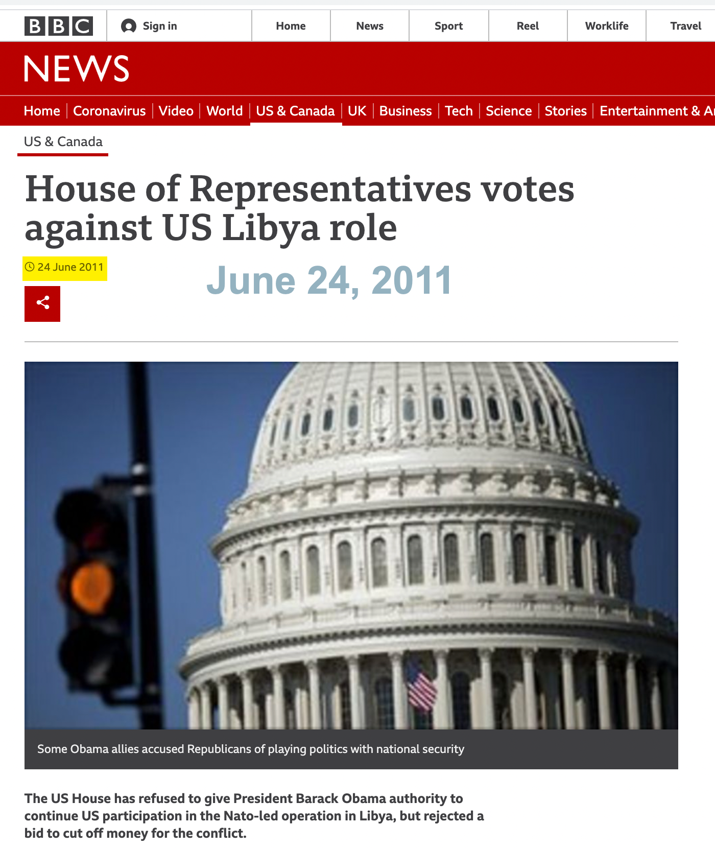 Mais comme le dit Ackerman, discuter de la légalité à ce stade n’a aucun sens, c’est un geste vide, une blague. Cela donne beaucoup trop de crédit à la classe dirigeante américaine, car cela implique qu’elle se soucie de savoir si sa posture de guerre sans fin est légale. Ils savent qu’elle est illégale et ne s’en soucient pas du tout. Beaucoup ont oublié que le président Obama a non seulement impliqué les États-Unis dans une guerre dévastatrice de changement de régime en Libye sans l’approbation du Congrès, mais, pire encore, qu’il a continué à le faire même après que la Chambre des représentants ait voté contre l’autorisation de recourir à la force en Libye. Obama a ignoré le vote de la Chambre et a tout de même maintenu des troupes en Libye dans le cadre d’une mission de l’OTAN, prétendant que l’autorisation de l’OTAN et de l’ONU l’autorisait d’une certaine manière à agir de la sorte malgré le vote négatif du Congrès de son propre pays, reflétant une opposition écrasante de la part des citoyens. (L’autorisation de l’ONU – même si elle pouvait d’une manière ou d’une autre supplanter la Constitution américaine – ne permettait l’usage de la force que pour protéger les civils, et non pour renverser le gouvernement libyen, ce qui est devenu rapidement et de manière prévisible la mission de l’OTAN, la rendant clairement illégale).