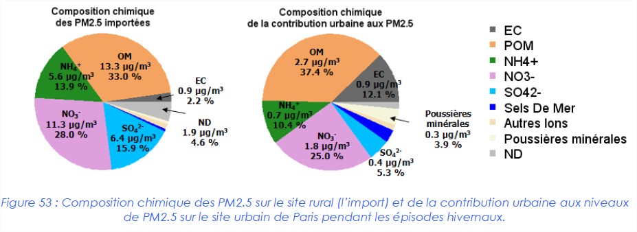 - à près de 40 % par de la matière organique, ce qui représente des concentrations 2 à 3 fois supérieures aux moyennes annuelles. La combustion de la biomasse (feux de cheminée ou feux de végétaux) expliquent la majorité de cette augmentation.