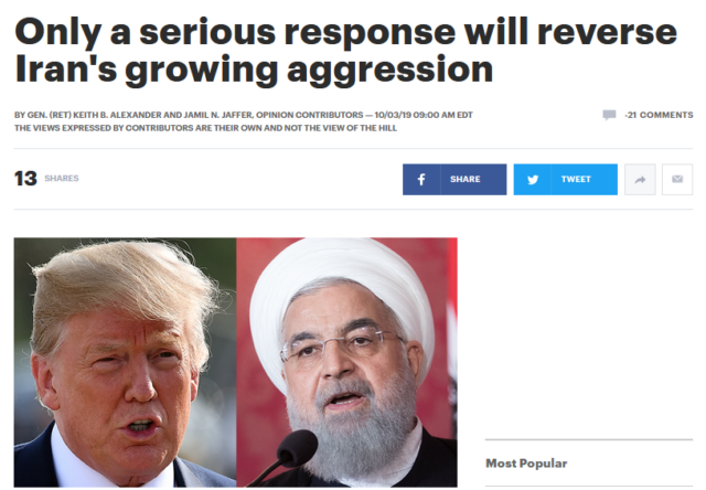 Pendant des mois, les médias ont été inondés d’histoires, basées sur les proclamations des responsables américains, selon lesquelles l’agression iranienne était à portée de main (par exemple, Yahoo ! News, 02/01/20 ; Reuters, 12/04/19 ; New York Times, 23/11/19 ; Washington Post, 22/06/19). The Hill (03/10/19) a donné à un général à la retraite l’espace nécessaire pour exiger que nous nous « défendions » en menant une « réponse sérieuse » contre l’Iran, qui « teste notre détermination par des actions agressives. »