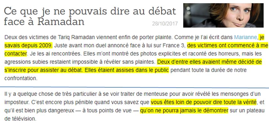 Elle se justifie cependant en disant que les victimes ne voulaient pas porter plainte (à sa décharge, il est vrai que certains de soutiens de Ramadan ne sont pas des plus pacifiques et tolérants…) :