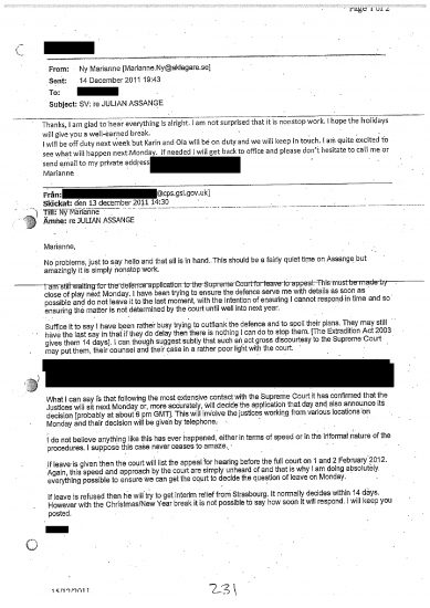 Je parle d’un « intérêt particulier » parce que les documents révèlent que dès le début de l’affaire suédoise, les autorités britanniques ont mis en garde les procureurs suédois contre la seule stratégie d’enquête qui aurait pu mener à une solution rapide de l’enquête préliminaire contre Assange : interroger le fondateur de WikiLeaks à Londres plutôt que l’extrader vers Stockholm. C’est cette décision d’insister à tout prix sur une extradition qui a conduit l’Australien à se réfugier à l’ambassade d’Équateur, se battant bec et ongles, convaincu que s’il était extradé vers la Suède, il pourrait finir extradé vers les États-Unis.