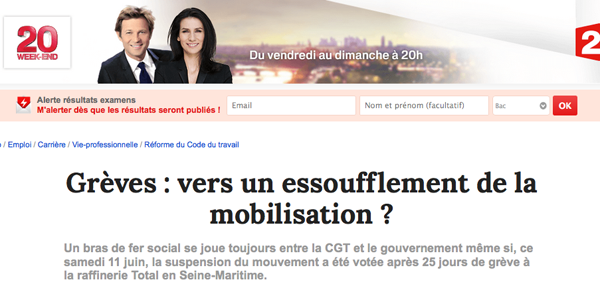 Fermons la parenthèse et reprenons : en juin, l’essoufflement ne s’essouffle pas, au contraire. Le 11, c’est le 20h de France 2 qui traite le sujet (entre les deux interventions, donc, de Mme Saint-Cricq annonçant l’essoufflement du mouvement, le 23 mai et le 14 juin). Le lancement pose la question :