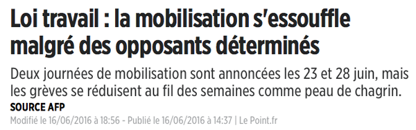 En résumé, si l’on en croit les médias dominants, le mouvement contre la Loi Travail n’a eu de cesse, semaine après semaine, de s’essouffler. Souvent réticents à rendre compte de la montée en force d’un mouvement social, ces médias se plaisent en revanche à en chroniquer, éventuellement sous une forme ingénument interrogative, le commencement de la fin, à en guetter les signes d’affaiblissement, au besoin dès le lendemain de son apparition – pour être certains d’avoir eu raison avant tout le monde ? À moins qu’il ne s’agisse, en multipliant les faire-part de décès de la mobilisation, d’instiller le doute chez les personnes mobilisées, de leur suggérer qu’elles sont isolées et qu’il ne sert à rien de s’entêter à continuer ? On ne saurait le croire – bien que le risque d’un effet performatif ne soit pas négligeable…