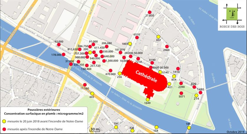 Les écoles des environs, elles, attendront l’été pour avoir droit à un grand nettoyage, voire pour certaines une réfection complète du revêtement de la cour, pour réduire la présence de poussières de plomb. Ce n’est que le 18 juillet que l’agence régionale de santé (ARS) d’Ile-de-France rend finalement publique la cartographie de la présence de poussières de plomb dans le quartier de Notre-Dame. On y découvre des taux exceptionnellement élevés, particulièrement sur le parvis : alors que la quantité n’excède généralement pas 5 000 microgrammes (µg) de poussières de plomb par mètre carré, le parvis en compte entre 540 000 et 1 300 000 µg/m², selon les relevés.