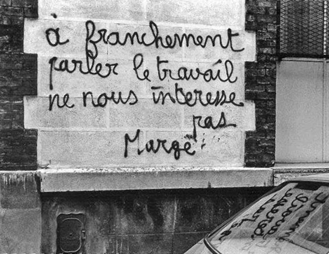 Il se pourrait en effet que tout ce qui se passe en ce moment se joue précisément autour de la connexion, puissamment mise en évidence par Bruno Le Roux, du contrat salarial et de la prison. Qui se trouve enfermé vraiment, c’est bien sûr là le point de controverse résiduel, auquel par bonheur ne s’arrêtent pas trop longtemps tous ceux qui, bombes de peinture à la main, réélaborent pour leur propre compte, et de manière assez vigoureuse, la grande intuition rouquinienne.