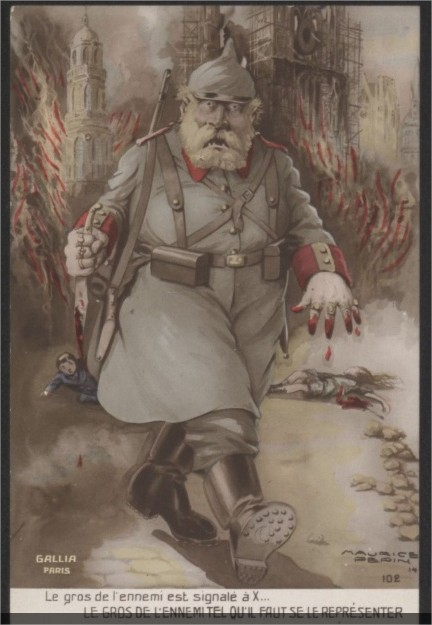 Le gros de l’ennemi tel qu’il faut se le représenter. Carte Illustrée. Maurice Pepin. Editeur Gallia, Paris. 1914. Evolution de l’archétype : soldat laissant derrière lui une ville enflamme et des cadavres d’enfants, un couteau ensanglanté à la main et une bague à chaque doigt, fruits du pillage. [OB : tiens, tiens, des bagues volées aux morts…] Source