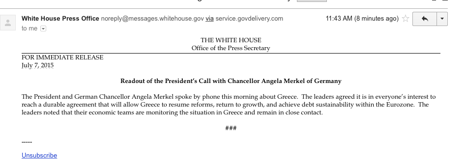 AlerterPeut être que certains, comme les baltringues des pays baltes, sortiraient bien la Grèce de l’ UE, mais alors ça ne fait pas du tout les affaires d’ Obama qui a téléphoné à Merkel pour lui dicter ses consignes notées sur une fiche de l’office de presse de la maison blanche voir image ci dessous :