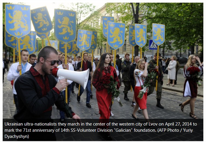 Le 27 avril 2014, à Lviv, des centaines de nationalistes manifestent en ce jour anniversaire de la création de la division SS Galicie (dont les manifestants portent l’emblème, ne faisant d’ailleurs pas de différence entre les nationalistes ayant rejoint les SS ou l’UPA) :