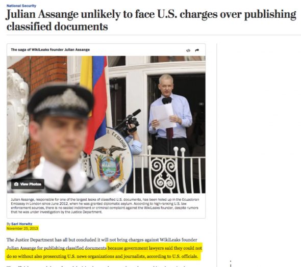 Comme l’a expliqué le Washington Post en 2013 lors de la décision du Ministère de la justice Obama de ne pas poursuivre Assange :