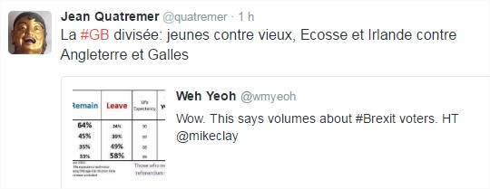 Il aurait été aussi intéressant d’avoir les résultats en valeur absolument (au lieu du pourcentage). Si cela se trouve, il y a peut être plus de vieux-bête-moche-et-con qui ont voté pour le remain que de jeunes.