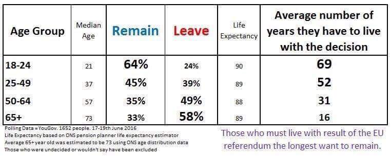 En suivant son raisonnement, le maintien dans l’Europe ayant des conséquences sur les générations futures, faudrait revoter d’urgence sur notre présence dans l’Europe ( mais la suite de sa logique c’est voter 3 fois, les bébés ayant plus de poids que les + de 60 ans, les +de80 ans c’est pas la peine de voter).