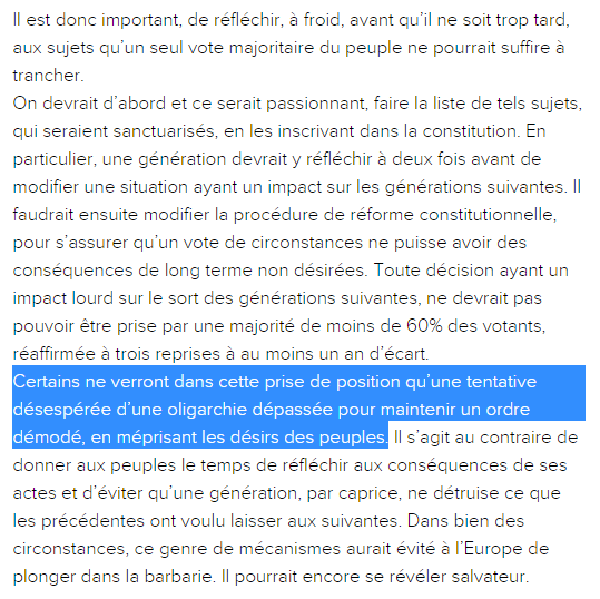 Alerter« Toute décision ayant un impact lourd sur le sort des générations suivantes, ne devrait pas pouvoir être prise par une majorité de moins de 60 % des votants, réaffirmé à 3 reprises à au moins un an d’écart »