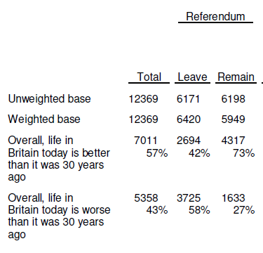 On voit aussi que des raison politiques profondes guident le Leave, et pas qu’économiques, puisqu’on calcule que 38 % de ceux qui pensent que la vie est meilleure veulent néanmoins partir (contre 70 % chez ceux qui pensent le contraire).