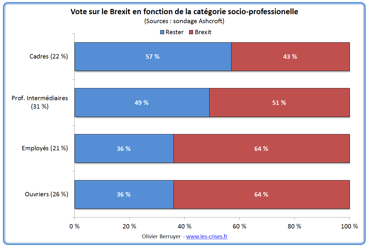 Alerter36% de travaillistes pour le Brexit, représentant tout de même 20% de ce camp…. On peut estimer qu’avec un « Remain » à 80% dans cet électorat, les britanniques seraient restés. Le peu d’enthousiasme des électeurs travaillistes envers l’UE aura fait la différence! On peut imaginer que ce serait dans un pays où le camp eurosceptique n’est pas dominé par des ultra-libéraux un tantinet xénophobes…