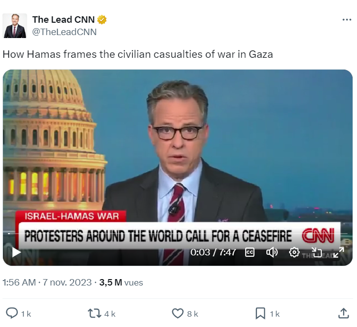 Comme l’a souligné Belén Fernández sur Al Jazeera, cette « analyse » de Tapper a été saluée par Brit Hume de Fox News. « Alors que Tapper continue d’auditionner pour le rôle de porte-parole de l’armée israélienne, un cessez-le-feu immédiat doit être décrété concernant le journalisme sanguinaire. »