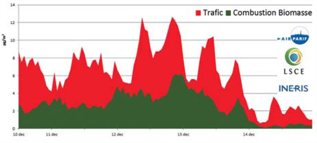 Lors de l’épisode de pollution du mois de décembre 2013, les mesures enregistrées sur le réseau de fond parisien ont permis d’identifier les causes de la pollution particulaire. Si le trafic reste majoritaire, le fort épisode hivernal a contribué à faire monter la part de la combustion de biomasse à 43 % en moyenne de la concentration en carbone suie.