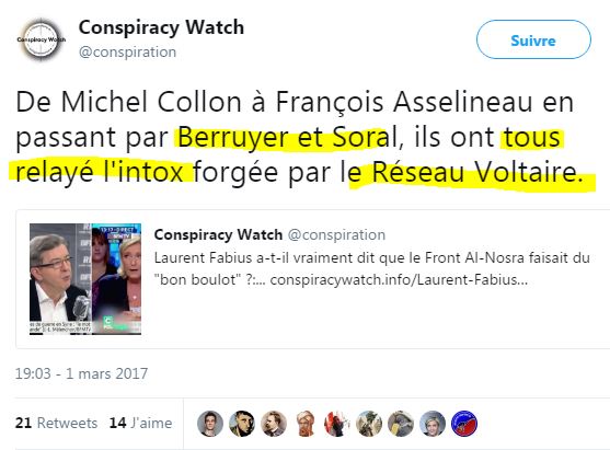 Je termine par une nouvelle illustration des méthodes du blogueur très controversé Rudy Reichstadt, visibles sur ce tweet :