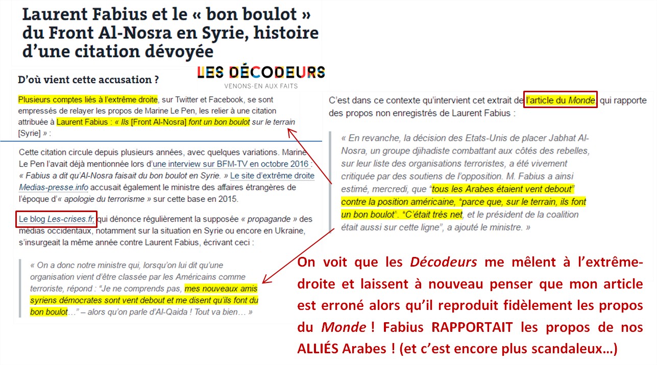 Fabius rapporte des propos mais le fait qu’il les rapporte indique qu’il les trouve pertinents. Rapporter des propos, c’est les valider au moins partiellement (ou alors, je peux en toute irresponsabilité dire « mon voisin pense que les décodeurs sont des Charlots »), sauf à préciser explicitement le contexte : Fabius n’a pas dit « [ils disent que] Al-Nosra fait un bon boulot, c’est scandaleux et ça impose à la France de s’éloigner de ces gens là ».