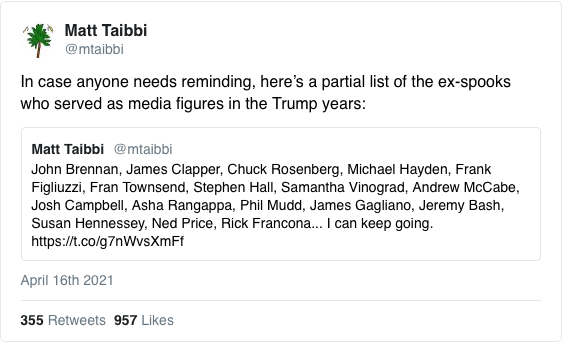 Au cas où quelqu’un aurait besoin de se le rappeler, voici une liste partielle des ex-espions qui ont servi de figures médiatiques pendant les années Trump :