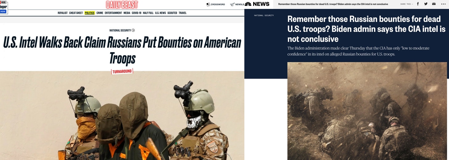 Ce qui a rendu cet aveu particulièrement bizarre – outre d’avoir rendu les propos que ces personnalités médiatiques et politiques ont tenu pendant des semaines honteusement téméraires et infondés – c’est que l’administration Biden a continué à prendre cette affirmation comme une vérité pas plus tard que jeudi. Lors de l’annonce des nouvelles sanctions visant Moscou et des expulsions de diplomates russes – principalement en réponse aux allégations de piratage informatique russe – la Maison Blanche a déclaré « qu’elle répondait à des informations selon lesquelles la Russie encourageait les combattants talibans à blesser ou à tuer les forces de la coalition en Afghanistan. »