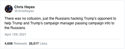 Il n’y a pas eu de collusion, juste des Russes qui ont piraté l’adversaire de Trump pour aider ce dernier et le directeur de campagne de Trump qui a transmis des informations sur la campagne aux Russes.