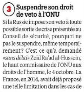 Donc il y a un droit de véto à l’ONU, mais quand la Russie l’utilise, c’est le maaaal. Bon, notez que la France a aussi utilisé son droit de véto à la résolution russe sur la Syrie, mais ça, les médias n’en ont pas parlé…