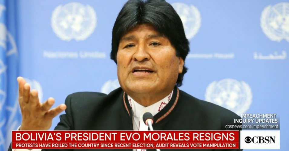 CNN (11/10/19) a rejeté les résultats de la récente élection, où la Bolivie a donné à Morales un nouveau mandat, comme truffé d’« accusations de fraude électorale », les présentant comme une farce où « Morales se déclare vainqueur ». L’article du Times (11/10/19) affirme que ce qui a mené à sa « démission », ce sont des « protestations » et des « accusations de fraude », plutôt que la contrainte sous la menace d’une arme de la part des militaires. Entre-temps, CBS News (11/10/19) n’a même pas inclus le mot « accusations » en titrant « Le président bolivien Evo Morales démissionne après une fraude électorale et des manifestations ».