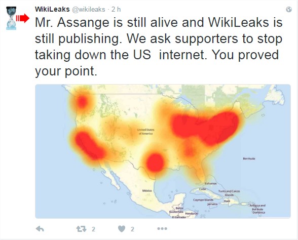 AlerterL’information principale de l’article, c’est que Assange aurait informé le net d’un rassemblement suspect de policiers armés auprès de l’ambassade équatorienne et les supporters/activistes de Wikileaks auraient répliqué par une attaque massive sur les serveurs DNS, perturbant sérieusement le net et l’activité de diverses entreprises.