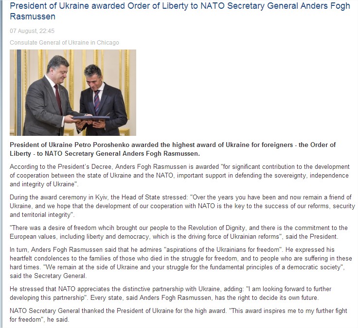 Le président Porochenko a remis à M. Fogh Rasmussen l’Ordre de la liberté ukrainien, pour sa contribution personnelle au développement des relations OTAN-Ukraine et son soutien en faveur de la souveraineté de l’Ukraine. « Nous soutenons l’Ukraine et votre combat pour la défense des principes fondamentaux sur lesquels nous avons construit nos sociétés libres », a-t-il déclaré en acceptant cette récompense.