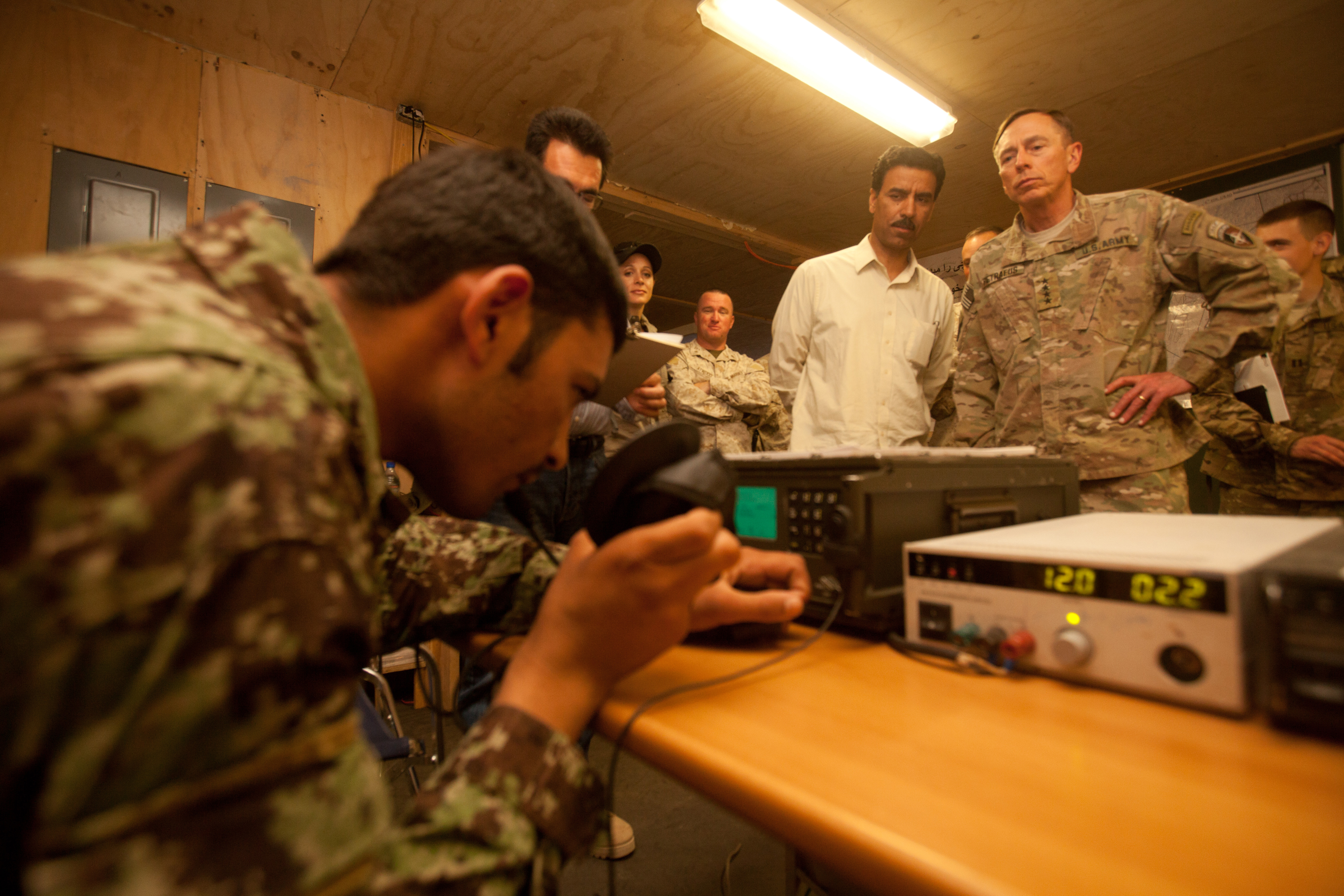 Petraeus procédant à l’évaluation d’un soldat de l’armée nationale afghane au camp Dwyer, dans le sud de la province de Helmand, en mai 2011. (Sergent Jesse Stence)
