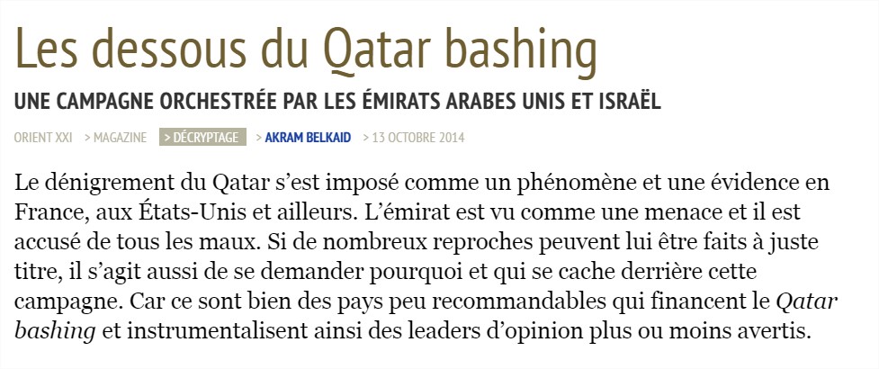 Je vous renvoie aussi sur ce 2e article de 2014 : Les dessous du Qatar bashing, Une campagne orchestrée par les Émirats Arabes Unis et Israël