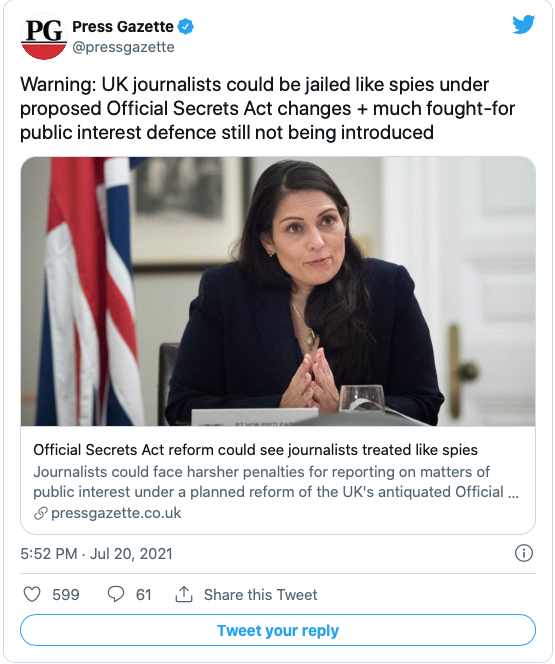 Dans le même temps, le ministère de l’Intérieur voit d’un mauvais œil la nécessité de protéger les journalistes. En réponse à la proposition de la Commission juridique d’introduire une défense « d’intérêt public » qui assurerait la protection des journalistes, le document de consultation affirme que « ces propositions pourraient en fait saper nos efforts pour empêcher les divulgations non autorisées préjudiciables. »