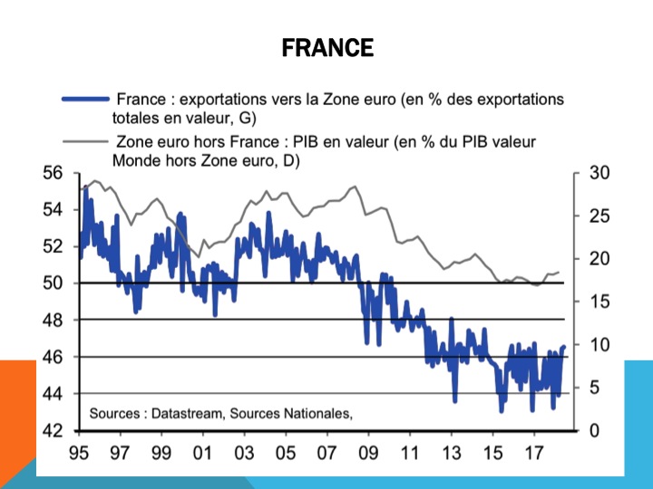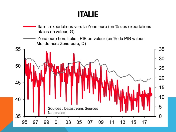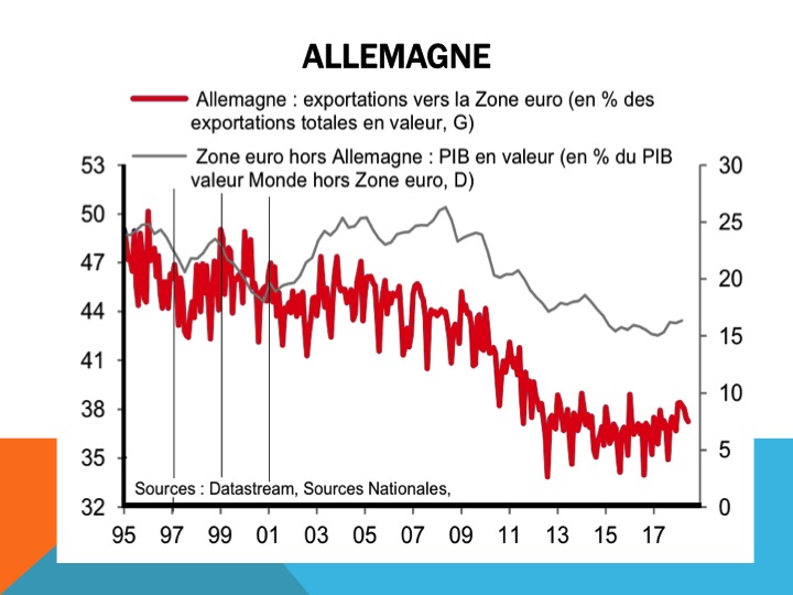 L’étude NATEXIS (réalisée par Patrick Artus) montre les évolutions de la balance commerciale en pourcentage du PIB que ce soit pour l’Allemagne ou pour des pays comme la France et l’Italie.
