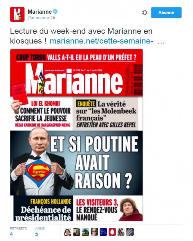 AlerterLe plus sûr moyen de vérifier combien Libé est dangereusement barré consiste à consulter l’excellent site web RT. Tous les jours, ce qui nous fait comprendre pourquoi notre presse meurt et crèvera malgré les fortunes des propriétaires actuels et les scandaleuses subventions qu’on extorque de la poche de tous les non lecteurs de ces faillites anciennes. Ne plus JAMAIS donner un euro à ces Figaro LePoint et autres qui crachent sur la pluralité des opinions et servent la soupe aux censeurs. N’achetez plus JAMAIS ces papiers de mensonges, soyons un peu militant et cohérent.
