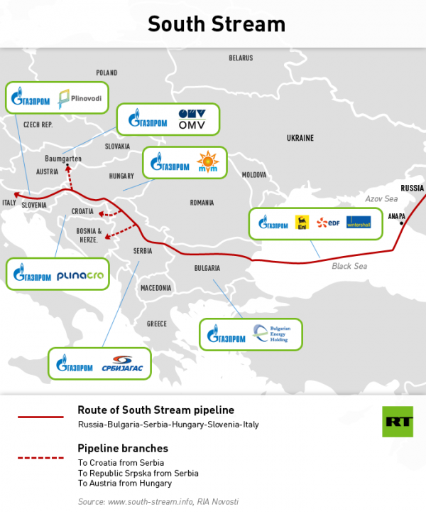 Pour comprendre ce qui s’est passé, il faut reprendre l’histoire du South Stream. Le projet naît de l’accord de partenariat stratégique, stipulé par la compagnie publique russe Gazprom et par l’italienne Eni en novembre 2006, pendant le gouvernement Prodi II. En juin 2007 le ministre pour le développement économique, Pierluigi Bersani, signe avec le ministre russe de l’industrie et de l’énergie le mémorandum d’entente pour la réalisation du South Stream. Le projet prévoit que le gazoduc sera composé d’un tronçon sous-marin de 930 km à travers la Mer Noire (en eaux territoriales russes, bulgares et turques) et par un tronçon sur terre à travers la Bulgarie, la Serbie, la Hongrie, la Slovénie et l’Italie jusqu’à Tarvisio (Province d’Udine). En 2012 entrent aussi dans la société par actions qui finance la réalisation du tronçon sous-marin la société allemande Wintershall et la française EDF à hauteur de 15 % chacune, alors qu’Eni (qui a cédé 30 %) détient 20 % et Gazprom 50 % des actions. La construction du gazoduc commence en décembre 2012, avec l’objectif de lancer la fourniture de gaz pour 2015. En mars 2014, Saipem (Eni) s’adjudique un contrat de 2 milliards d’euros pour la construction de la première ligne du gazoduc sous-marin.