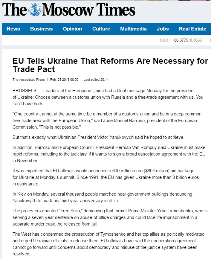 Rien de bien extraordinaire en soi : oui, l’UE a simplement rappelé une évidence économique : l’Ukraine, qui appartenait alors à la Zone de libre échange avec la Russie (ce qui profitait beaucoup aux régions frontalières de l’est, industrialisées) ne pouvait appartenir à deux zones de libre-échange à la fois. Cela tombe sous le sens, sinon, il n’y en a pratiquement plus qu’une de facto. Bref, l’information que j’ai rapportée est importante… et très logique.